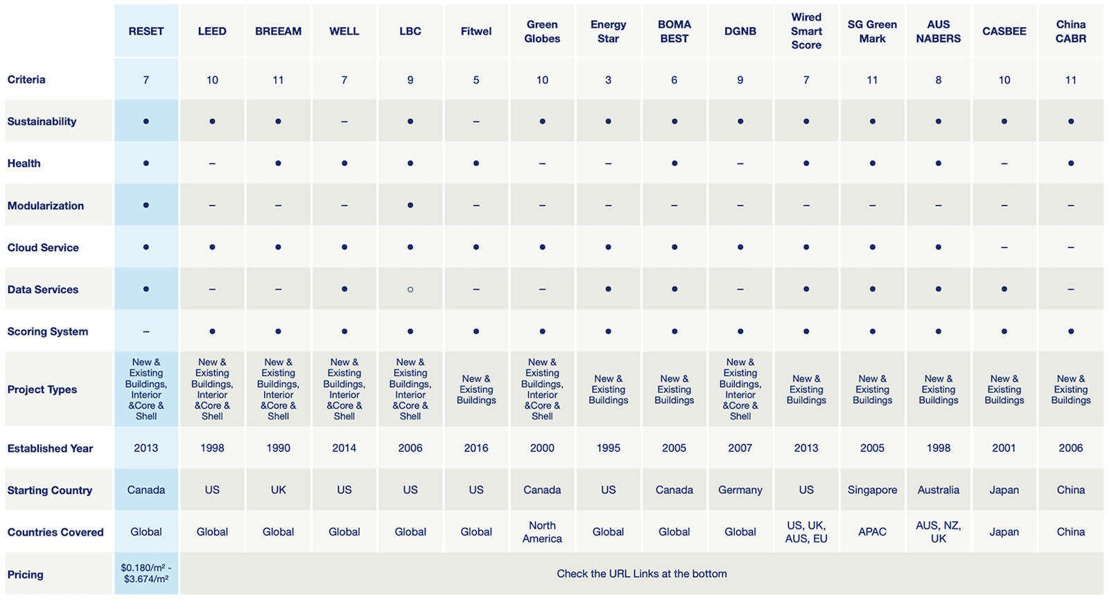 Below you will find the comparison by RESET®, looking at 13 of the most widely recognized and used green building standards in current markets. Each standard is compared and summarized across multiple aspects, including criteria, data requirements, scoring system, and more.